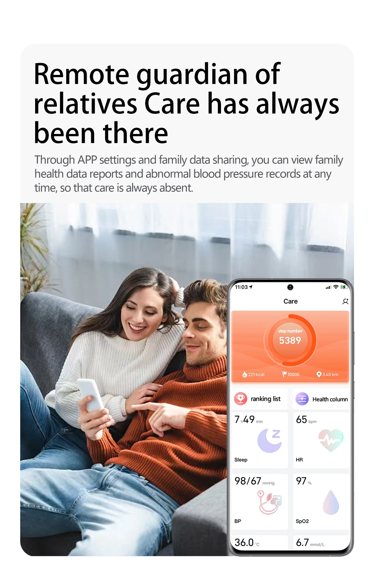 • Sync via HealthWear App for Android/iOS, enabling real-time sharing with loved ones and remote caregivers.