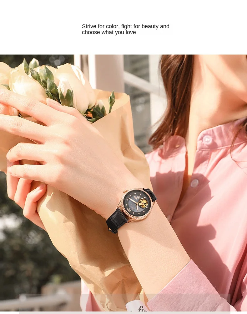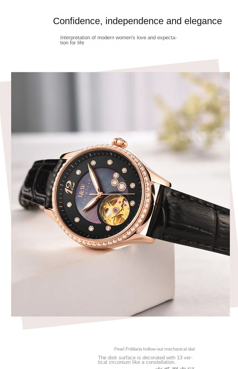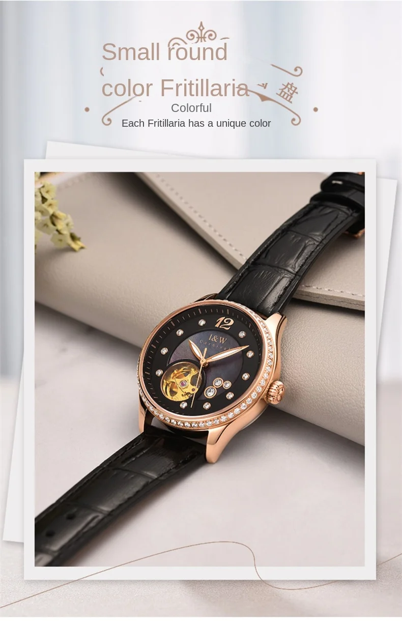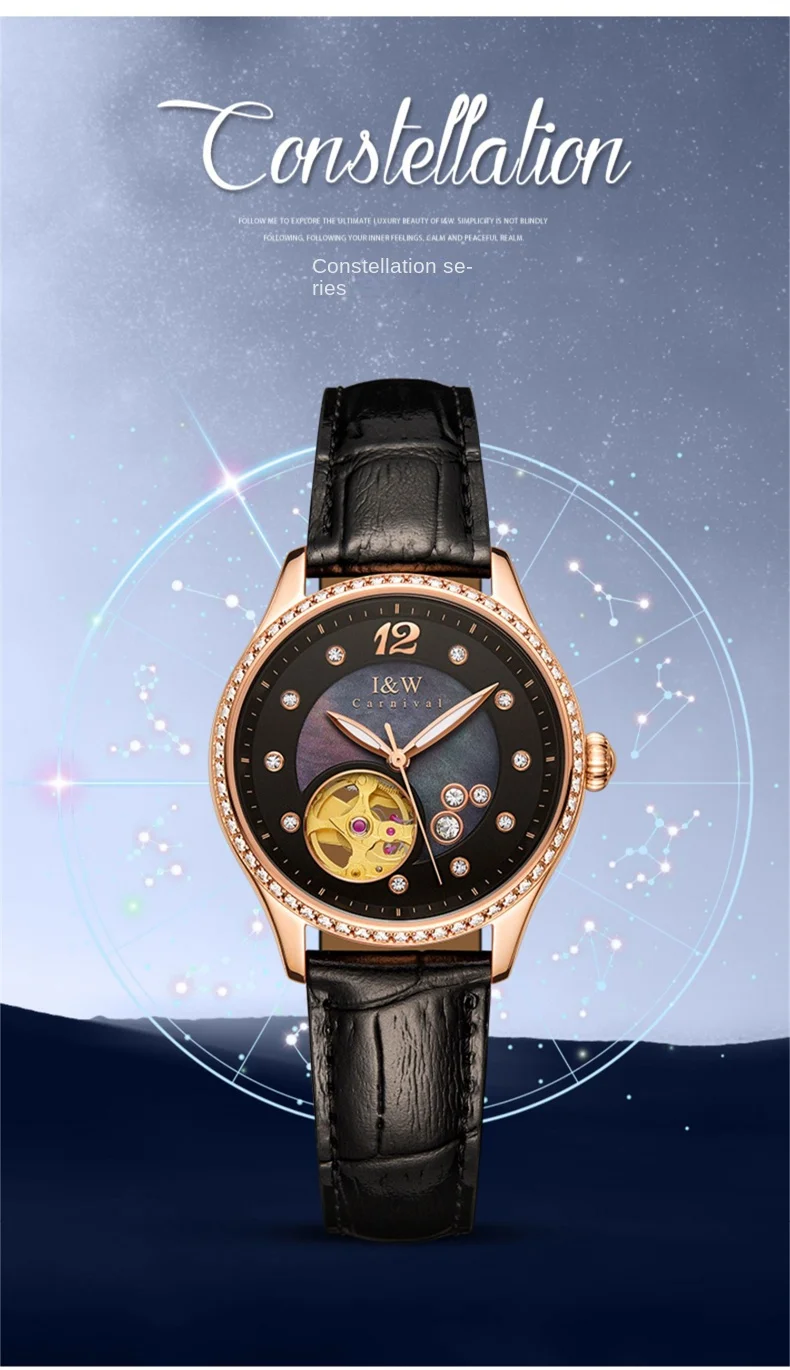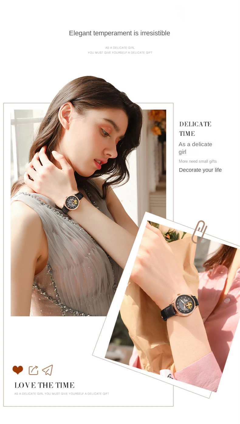 The see-through dial with luminous hands adds sophistication, while its 3ATM water resistance and hidden clasp ensure practicality and comfort. Elisoria® is a true embodiment of timeless femininity with a mechanical soul.