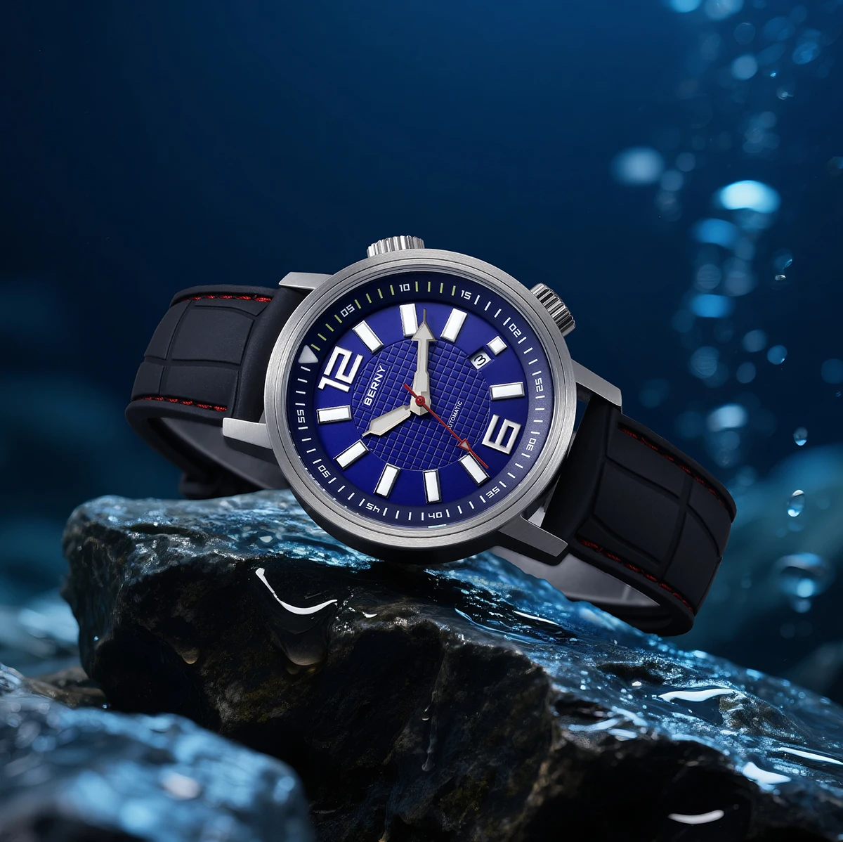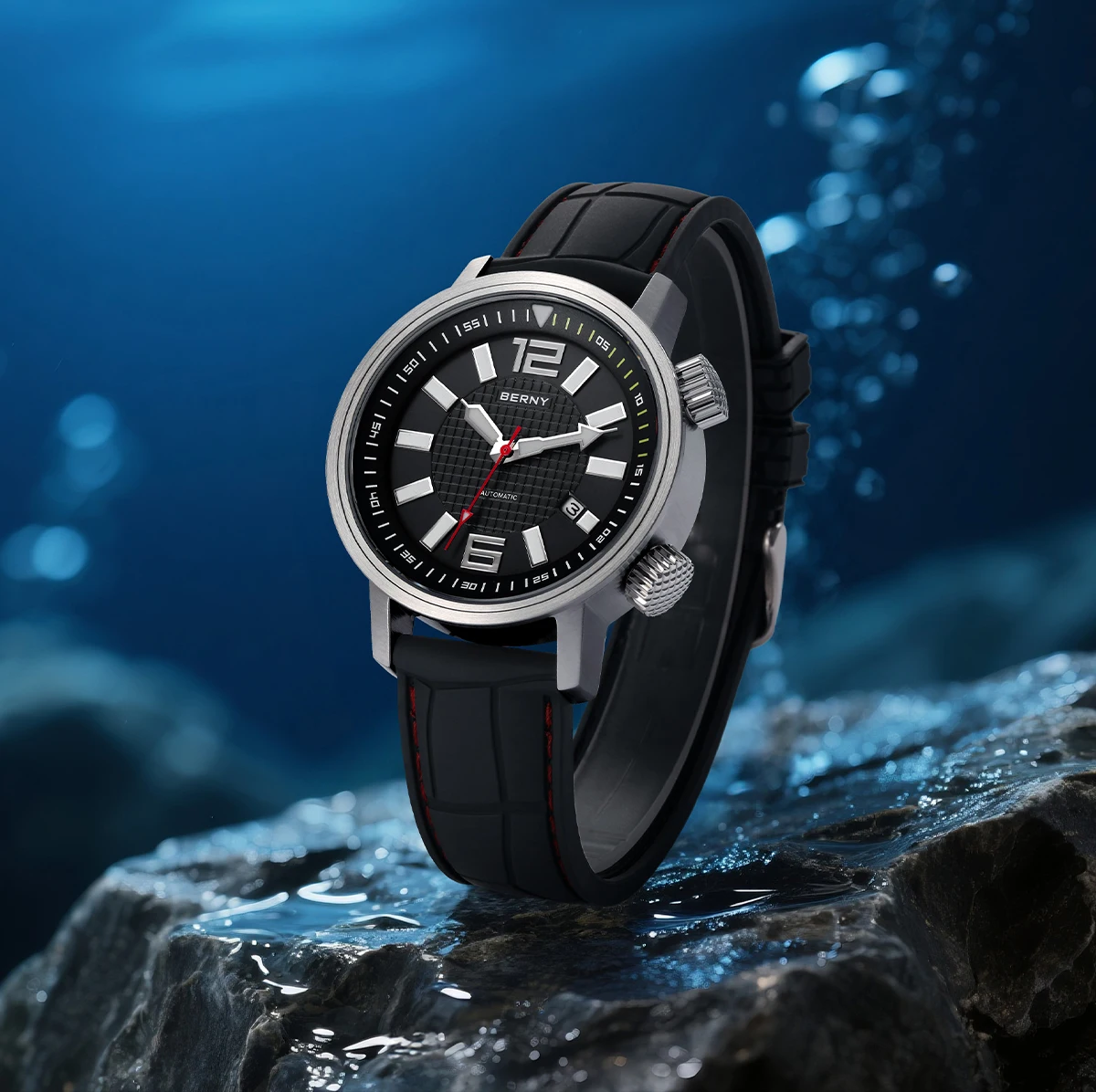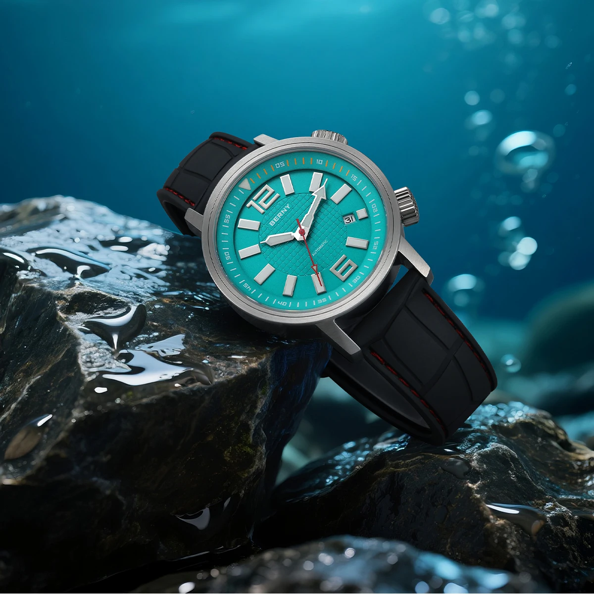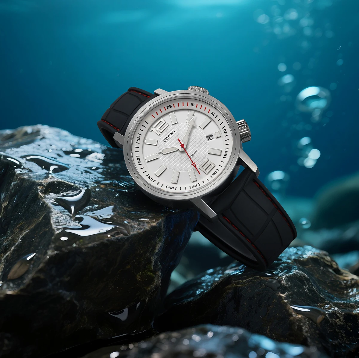 Built for underwater adventurers, the Kharvex® Deepcore 44 embodies rugged endurance with refined precision. Featuring a robust Miyota 8215 automatic movement, dual sapphire crystal, and a resilient fluororubber strap, it’s ready to face the deep with confidence and style.