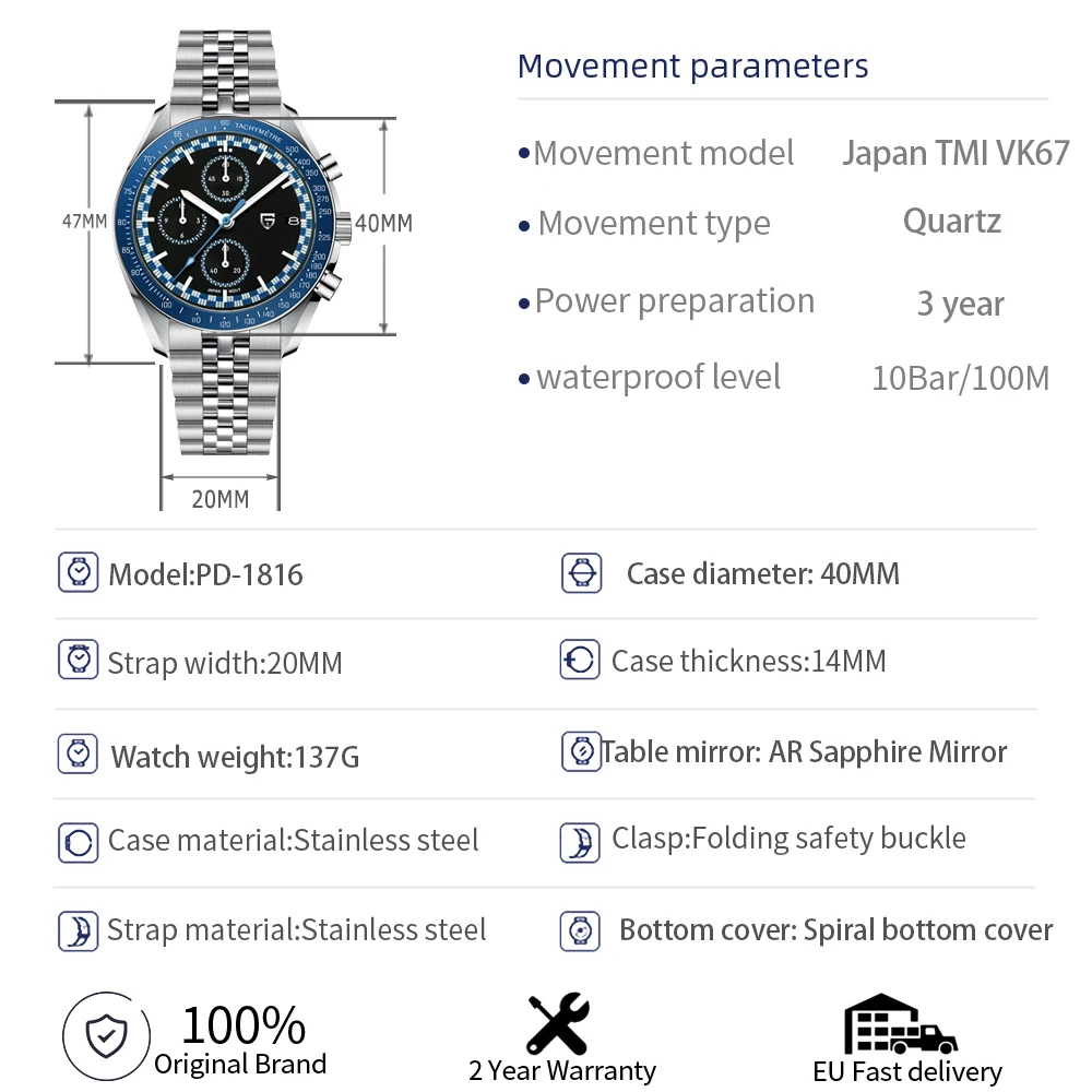 Pagaro Style® 2025 – Racing Chronograph Sport Quartz Men’s Watch, Japan VK67 Movement, AR Sapphire Crystal is a premium men’s sports watch with a bold racing-inspired design. Powered by a precise Japanese VK67 quartz movement, it features AR-coated sapphire crystal for superior clarity. The stainless steel case and bracelet ensure durability, while its 10ATM water resistance makes it suitable for swimming.